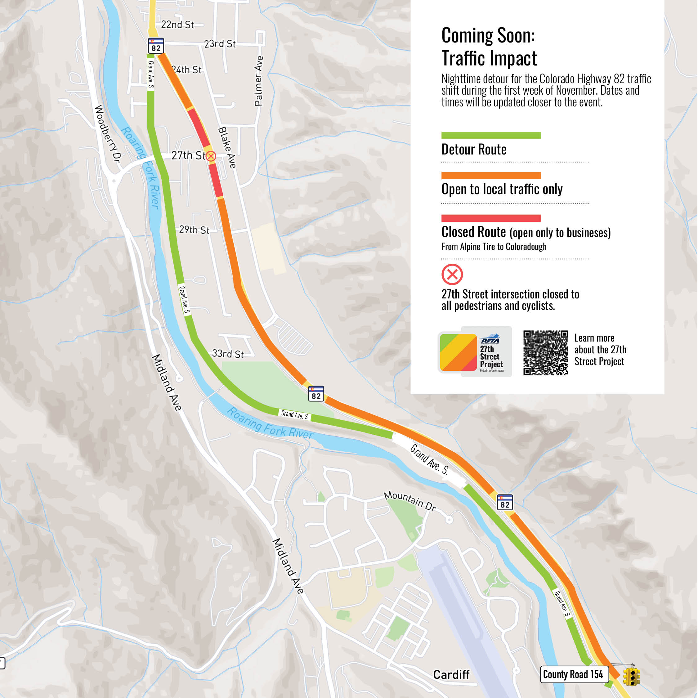The map to the right depicts the anticipated detour. This will be a nighttime full closure of Highway 82 at 27th St. and the date and time of the closure will be published closer to the event.